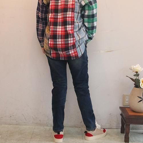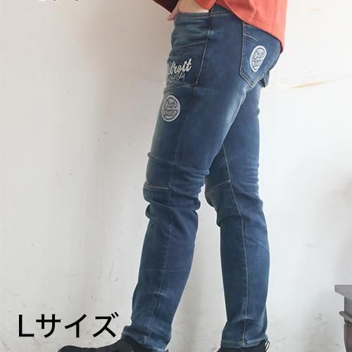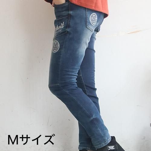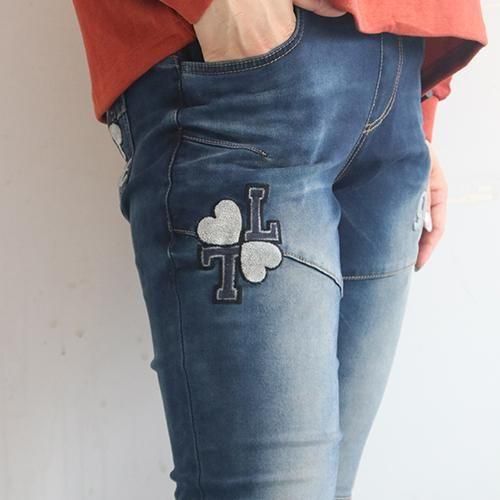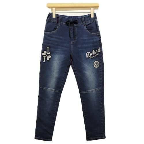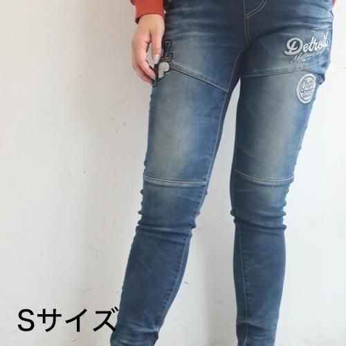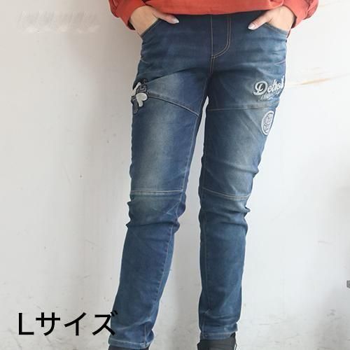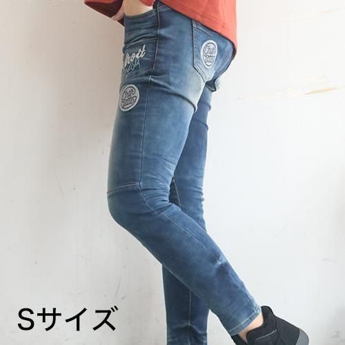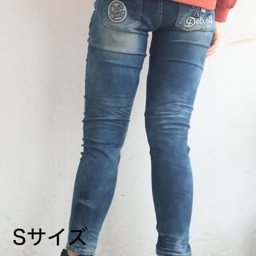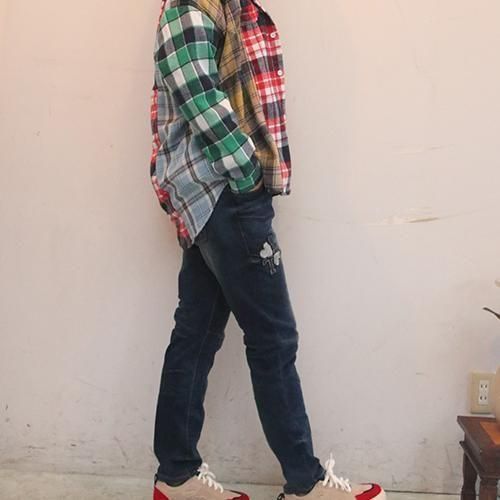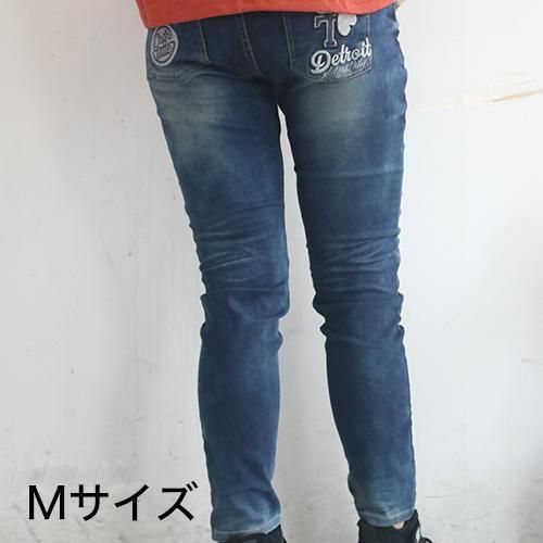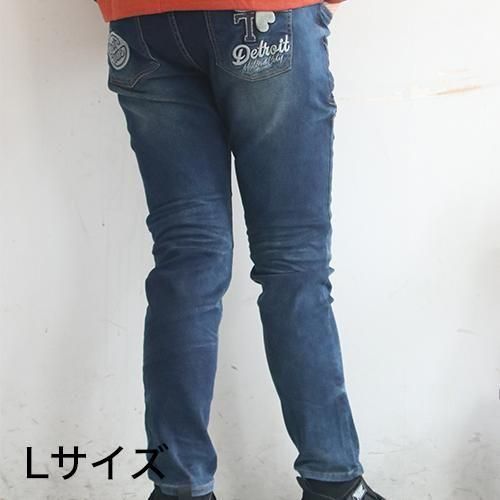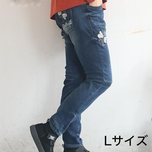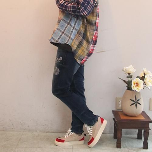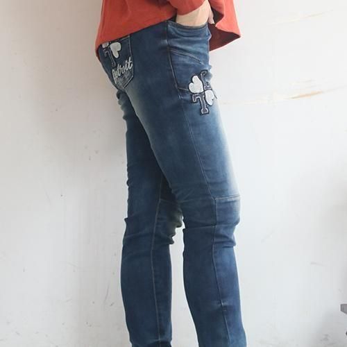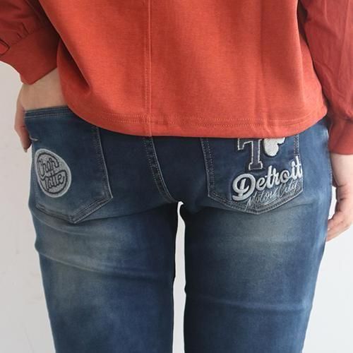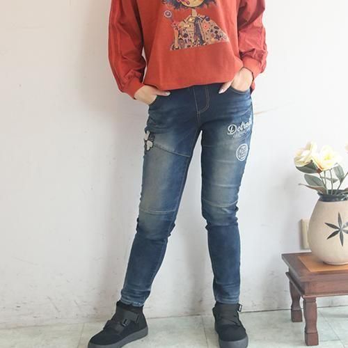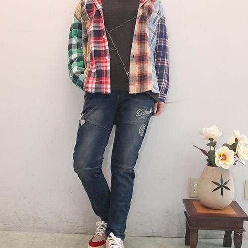 柔らかいストレッチ素材で快適な穿き心地を叶えつつ、洗い加工と刺繍のパッチワークがアクセントになった一本。