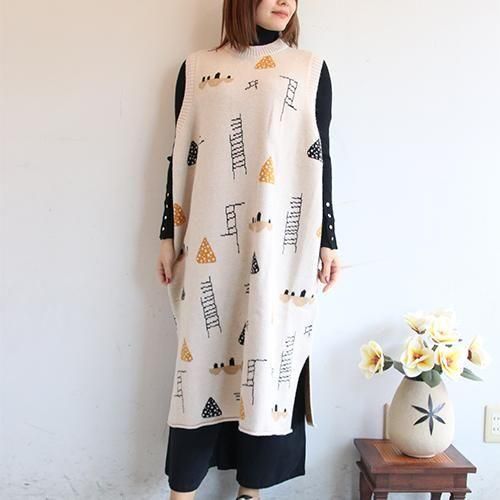 【体型カバー×大人可愛い】遊び心柄ニットワンピース|裾スリットで軽やかに着こなす主役アイテム