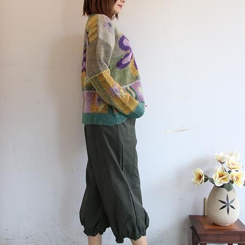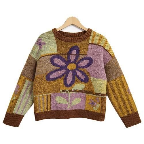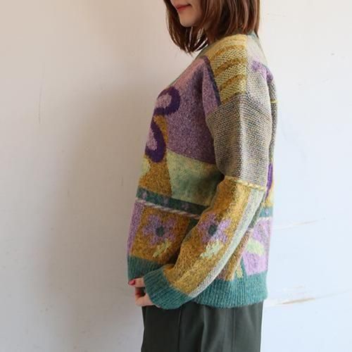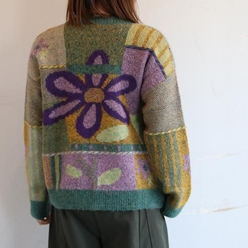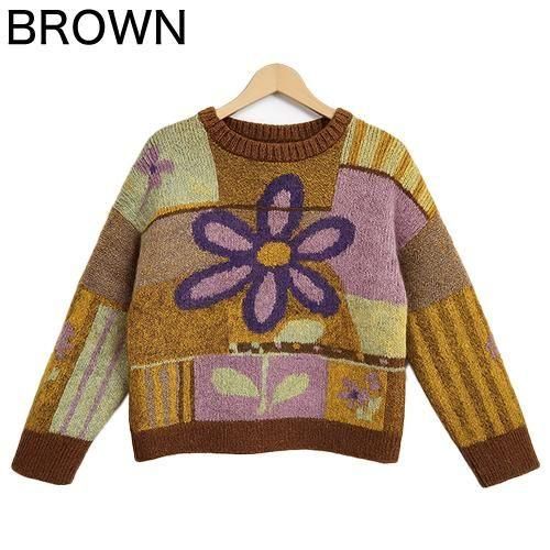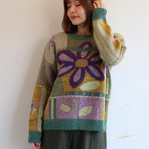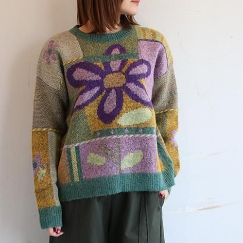 存在感のある大きなフラワーモチーフと、ニュアンスカラーのパッチワークが目を惹くデザインニット。